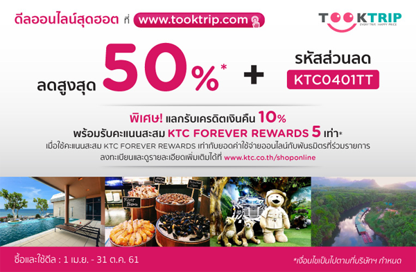 th.traveligo.com/ktc พิเศษ!! แลกรับเครดิตเงินคืน 10% และรับคะแนนสะสม KTC FOREVER REWARDS 5 เท่า* เมื่อใช้คะแนนสะสม KTC FOREVER REWARDS เท่ายอดซื้อ (*คะแนนสะสมปกติ 1 เท่า + คะแนนสะสมพิเศษ 4 เท่า)