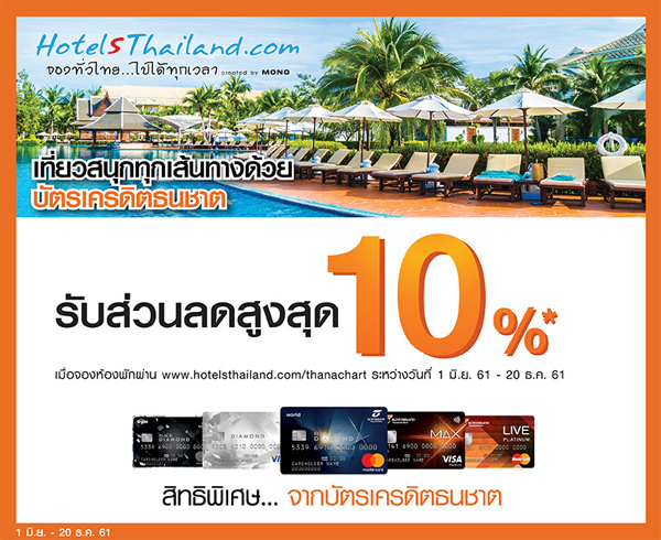 รายละเอียดโปรโมชั่น : เที่ยวสนุกทุกเส้นทางด้วยบัตรเครดิตธนชาต รับส่วนลดสูงสุด 10% เมื่อจองห้องพักผ่าน