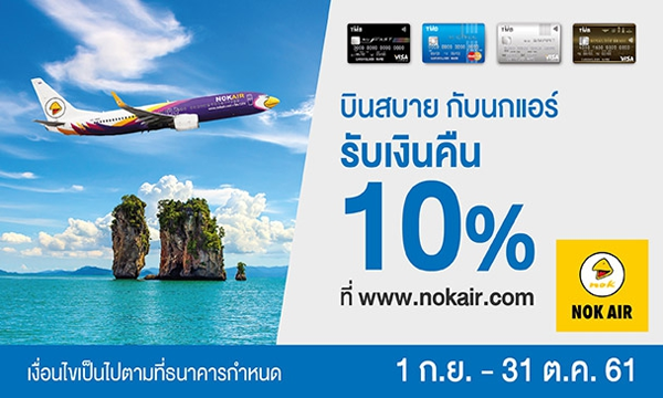 รายละเอียดโปรโมชั่น : บินสบายกับนกแอร์ (รับเงินคืน 10% รับเงินคืน 500 บาท เมื่อชำระค่าบัตรโดยสาร และบริการของสายการบินนกแอร์ ตั้งแต่ 5,000 บาทขึ้นไป) ที่