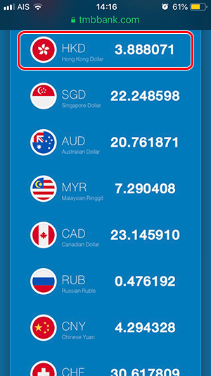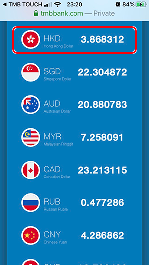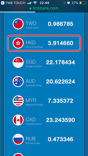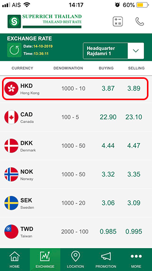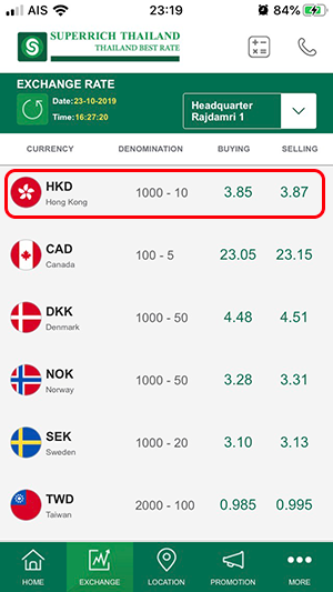 อัตราแลกเปลี่ยนของวันที่ 23 ตุลาคม 2562 (กรณีที่เราต้องการไปแลกเงิน ต้องดูที่ด้าน "Selling" หรือ "ราคาแลกซื้อ") อัตราแลกเปลี่ยนสกุลเงิน HKD ยังคงลดลงเรื่อยๆ จากเมื่อต้นเดือนค่ะ แต่ลดลงไม่มากนัก สำหรับของ TMB All Free อัตราแลกเปลี่ยนอยู่ที่ 3.868312 และอัตราแลกเปลี่ยนของ Superrich อยู่ที่ 3.87 ค่ะ ซึ่งแนวโน้มก็ลดลงทั้ง 2 ที่ แต่อัตราแลกเปลี่ยนของ Superrich ยังสูงกว่าของ TMB All Free ค่ะ