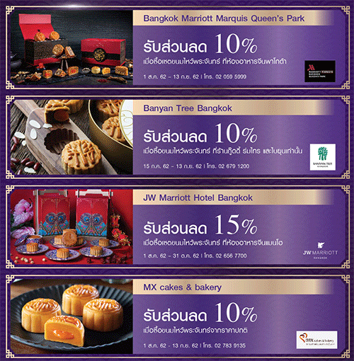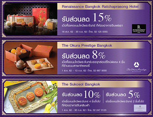 - รับส่วนลด 15% เมื่อซื้อขนมไหว้พระจันทร์ จากราคาปกติ (1 ส.ค. 62 - 15 ส.ค. 62)