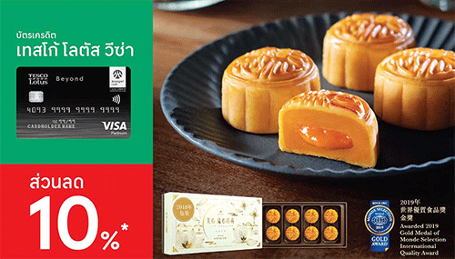 ลูกค้าบัตรเครดิตเทสโก้ โลตัส วีซ่า รับสิทธิพิเศษที่ MX Cake&Bakery รับส่วนลด 10%* เมื่อซื้อขนมไหว้พระจันทร์ MX (จากราคาปกติ) ใช้ได้ทุกสาขา และบูธ MX Mooncake