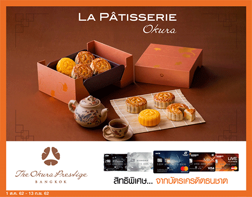 โรงแรมโอกุระ เพรสทีจ กรุงเทพฯ (The Okura Prestige Bangkok) โทร. 02-687-9000 | สำหรับบัตรเครดิต KTC ทุกประเภท - รับส่วนลด 10% เมื่อซื้อขนมไหว้พระจันทร์ บรรจุกล่องดีไซน์พิเศษ ที่ร้านขนม ลา พาทิซเซอร์รี่ (จันทร์ - ศุกร์) ขนมไหว้พระจันทร์ 4 ชิ้น ราคาสุทธิ 1,168 บาท