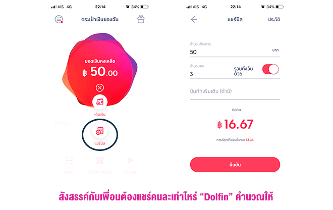 เคยเจอมั้ยครับ Pain Point อย่างหนึ่งเวลาไปกินข้าวกับเพื่อนๆ แล้วต้องมานั่งกดเครื่องคิดเลขหารว่าต้องแชร์กันคนละเท่าไหร่ แต่แอปฯ นี้มีปุ่ม "แชร์บิล" ซึ่งหมายถึงว่าเวลาเราใช้ Dolfin ซื้อสินค้าเสร็จ เรากดปุ่มนี้ จะบอกให้เลยว่า ถ้ามา 3 คน ก็กดหารด้วย 3 แต่ละคนต้องจ่ายเท่าไหร่ และถ้าทุกคนใช้ Promptpay หรือมี Dolfin กันหมด ก็กดโอน กดรับเงินกันได้เลยภายในคลิกเดียวจบ สะดวกมาก