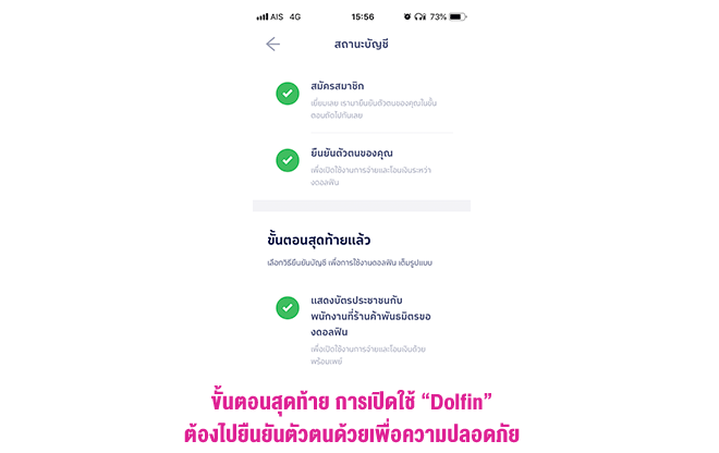 3. สุดท้ายต้องไปยืนยันตัวตนโดยการแสดงบัตรประชาชนตัวจริงกับร้านค้าพันธมิตรของ Dolfin เช่น ตาม Booth ในห้างฯ Tops Supermarket ตอนนี้ เป็นต้น ทั้งนี้เพื่อเป็นการยืนยันว่าบัตรประชาชนที่นำมาสมัครบริการกับผู้สมัครนั้นเป็นบุคคลคนเดียวกันจริงเพื่อระบบความปลอดภัยสูงสุดของผู้ใช้บริการ