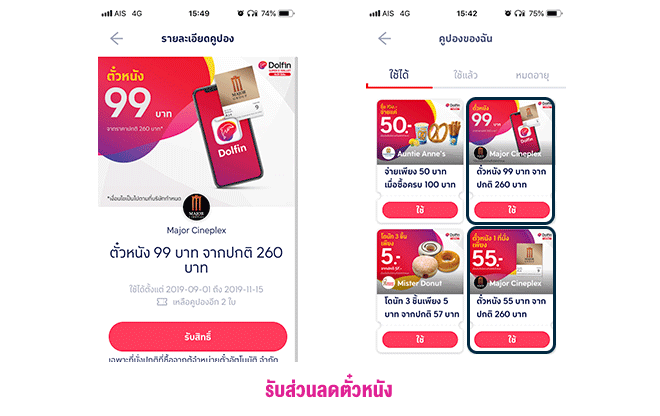 สามารถใช้แอปฯ Dolfin ได้ในเครือ Major, EGV, Esplanade Cineplex และในบางช่วงก็จะมีโปรโมชั่นของบางค่ายด้วย เช่น เครือ Major Cineplex ถ้าใช้ Dolfin ซื้อตั๋วก็จะได้ราคาเพียง 99 บาท จากราคาปกติ 260 บาท เพราะฉะนั้น ก่อนดูหนังทุกเรื่อง ลองเข้ามาเช็คโปรโมชั่นในแอปฯ Dolfin กันก่อนทุกครั้งนะครับ
