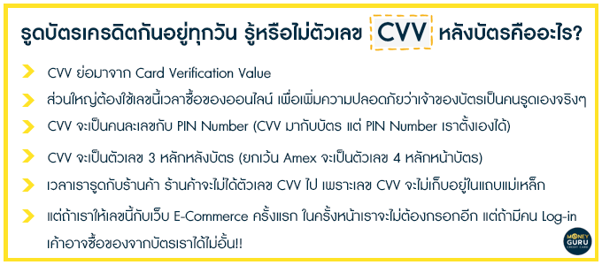 สำคัญสุด!! ตัวเลขหลังบัตร 3 หลักควรเก็บเป็นความลับ เพราะรหัส CVV นั้นเป็นตัวยืนยันการทำธุรกรรมต่างๆ ของเราในขั้นตอนสุดท้าย ถ้าหากมีคนรู้รหัส 3 ตัวหลังบนบัตรเครดิตของเรา หรือกรณีถูกขโมยบัตรเครดิตไป และนำไปใช้ทำธุรกรรมต่างๆ แทนเรา ก็จะทำให้เกิดความเสียหายได้ เพราะฉะนั้น ... วิธีการป้องกันการเกิดหนี้ หรือการโจรกรรมข้อมูลบัตรเครดิตจากมิจฉาชีพทั้งหลายนั้น ทำได้ด้วยการเก็บข้อมูลบัตรเครดิตไว้ให้เป็นความลับที่สุด (ทั้งบนหน้าบัตรและหลังบัตร) โดยเฉพาะอย่างยิ่ง หมายเลขบัตรเครดิต 16 หลัก และเลขรหัส CVV ต้องฝึกให้เป็นนิสัยด้วยการเก็บบัตรเครดิตเข้ากระเป๋าสตางค์ทันที หลังจากที่ใช้บัตรฯ ซื้อสินค้าหรือทำธุรกรรมเสร็จเรียบร้อยแล้ว เพื่อป้องกันบัตรฯ หาย และอย่าจดรหัส CVV ไว้ในกระเป๋าสตางค์เด็ดขาด หากทำบัตรเครดิตหายต้องรีบโทรแจ้งอายัดบัตรฯ ทันทีนะครับ