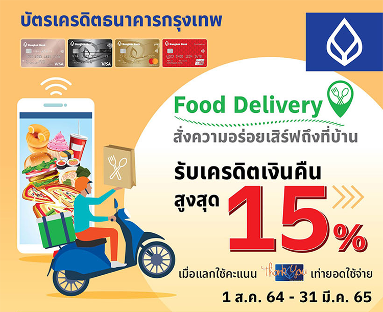 บัตรเครดิตธนาคารกรุงเทพ สั่งอาหารผ่านบริการ Food Delivery ที่ร่วมรายการ โดยมียอดใช้จ่ายผ่านบัตร 100 บาทขึ้นไป/ เซลส์สลิป รับเครดิตเงินคืน สูงสุด 15% เมื่อแลกใช้คะแนนเท่ายอดใช้จ่าย