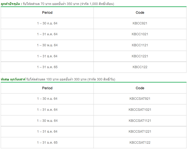 - โค้ดส่วนลดที่ผู้ถือบัตรได้รับสามารถใช้ได้ถึง 30 พฤศจิกายน 2564