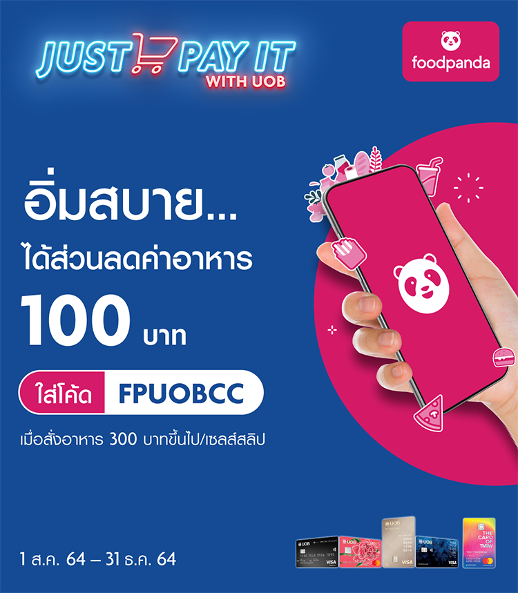 สำหรับผู้ถือบัตรเครดิตยูโอบีทุกประเภท และบัตรเครดิต TMRW ที่ออกในประเทศไทยเท่านั้น ยกเว้นบัตรเครดิตเพื่อธุรกิจ โดยผู้ถือบัตรจะต้องคงสถานะการเป็นสมาชิกบัตรเครดิตและไม่ผิดนัดชำระจนถึงวันที่ใช้โค้ดส่วนลด เมื่อสั่งอาหารผ่าน foodpanda application หรือ www.foodpanda.co.th ตั้งแต่ 300 บาทขึ้นไป/เซลส์สลิป รับส่วนลด 100 บาท โดยใช้โค้ด FPUOBCC