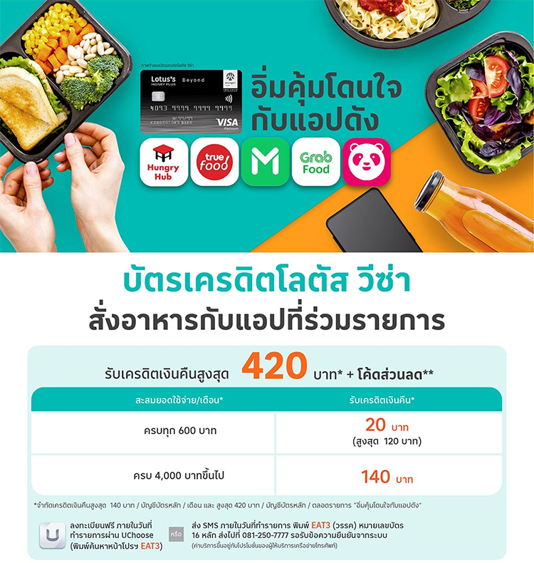 บัตรเครดิต โลตัส วีซ่า อิ่มคุ้มโดนใจกับแอปดัง รับเครดิตเงินคืนสูงสุด 420 บาท* + โค้ดส่วนลด** 5 แอปพลิเคชั่น True Food, Lineman, Grab Food, FoodPanda, Hungry Hub