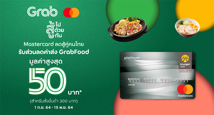 เมื่อผูกบัตรเครดิต กรุงศรี มาสเตอร์การ์ด และสั่งอาหารผ่าน GrabFood รับส่วนลดค่าส่งมูลค่า 50 บาท* โดยเมื่อสั่งอาหารครบ 300 บาทขึ้นไป/ออร์เดอร์ โดยใส่รหัส DELIMC (* จำกัด 5 สิทธิ์ต่อผู้ใช้ตลอดระยะเวลาแคมเปญ โดยสิทธิ์ จำกัด 48,000 สิทธิ์ตลอดระยะเวลาแคมเปญ)