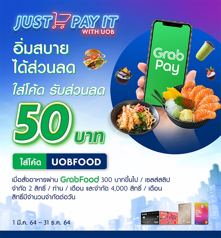Just Pay It with GrabFood รับรหัสส่วนลดค่าอาหาร UOBFOOD มูลค่า 50 บาท (ไม่รวมค่าส่ง) สำหรับการสั่งอาหารผ่าน GrabFood เมื่อมียอดสั่งอาหารขั้นต่ำ 300 บาทขึ้นไป / เซลล์สลิป
