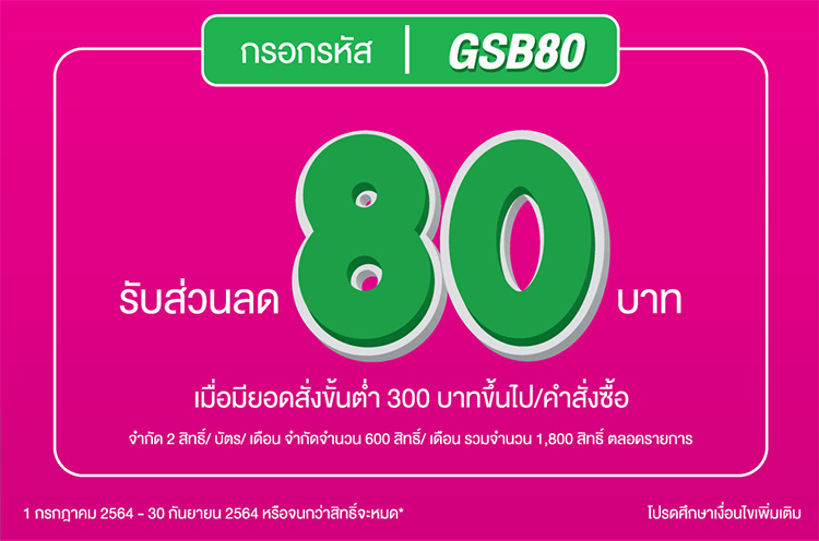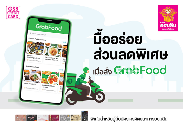 สิทธิพิเศษสำหรับผู้ถือบัตรเครดิตธนาคารออมสิน รับส่วนลดสูงสุด 80 บาท เมื่อมียอดสั่งขั้นต่ำ 300 บาทขึ้นไป/คำสั่งซื้อ ที่ GrabFood จำกัด 2 สิทธิ์/ บัตร/ เดือน จำกัดจำนวน 600 สิทธิ์/ เดือน รวมจำนวน 1,800 สิทธิ์ ตลอดรายการ