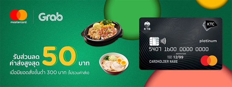 โปรโมชั่นสำหรับสมาชิกบัตรเครดิต KTC MASTERCARD ที่ GrabFood รับส่วนลดค่าส่งสูงสุด 50 บาท บน GrabFood เมื่อมียอดสั่งขั้นต่ำ 300 บาท (ไม่รวมค่าส่ง) และกรอกรหัส DELIMC