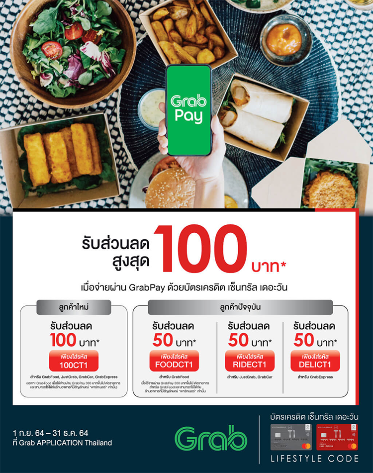 รับส่วนลดสูงสุด 100 บาท* เมื่อจ่ายผ่าน GrabPay ด้วยบัตรเครดิต เซ็นทรัล เดอะวัน ที่ Grab Application Thailand