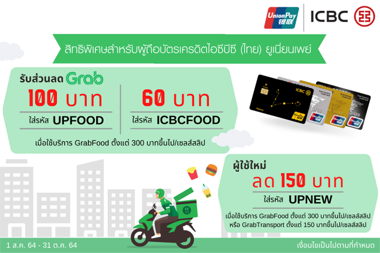- สำหรับผู้ใช้ใหม่ รับส่วนลด 150 บาท เมื่อบาท เมื่อใช้จ่าย GrabFood ผ่านบัตรเครดิตไอซีบีซี (ไทย) ตั้งแต่ 300 บาทขึ้นไป/ เซลส์สลิปหรือ Grab Transport ตั้งแต่ 150 บาทขึ้นไป/เซลส์สลิป ในครั้งแรก โดยกรอกรหัส UPNEW ในช่องกรอกรหัส และเลือก GrabPay เป็นวิธีการชำระเงิน โดยเลือกบัตรเครดิตไอซีบีซี (ไทย) ยูเนี่ยนเพย์ ก่อนที่จะทำการสั่งอาหารเท่านั้น โดยจำกัด 1 สิทธิ์ / ผู้ใช้ / เดือน