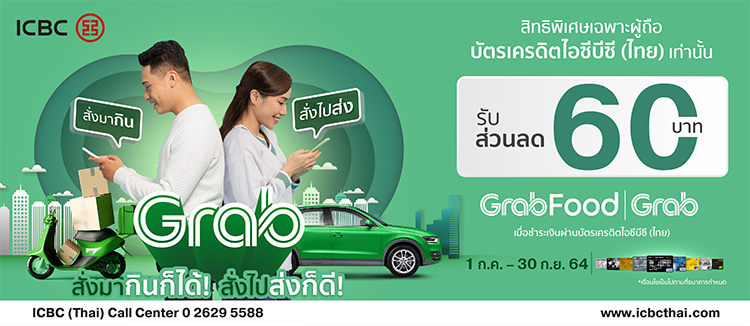 - ผู้ถือบัตรเครดิตไอซีบีซี (ไทย) วีซ่า, โกลบอล วีซ่าทราเวล หรือยูเนี่ยนเพย์ รับส่วนลดค่าอาหารมูลค่า 60 บาท เมื่อใช้บริการ GrabFood ตั้งแต่ 300 บาทขึ้นไป โดยกรอกรหัส ICBCFOOD ในช่องกรอกรหัส และเลือก GrabPay เป็นวิธีการชำระเงิน โดยเลือกบัตรเครดิตไอซีบีซี (ไทย) ข้างต้นก่อนที่จะทำการสั่งอาหารเท่านั้น โดยจำกัด 4 สิทธิ์ / ผู้ใช้ / เดือน