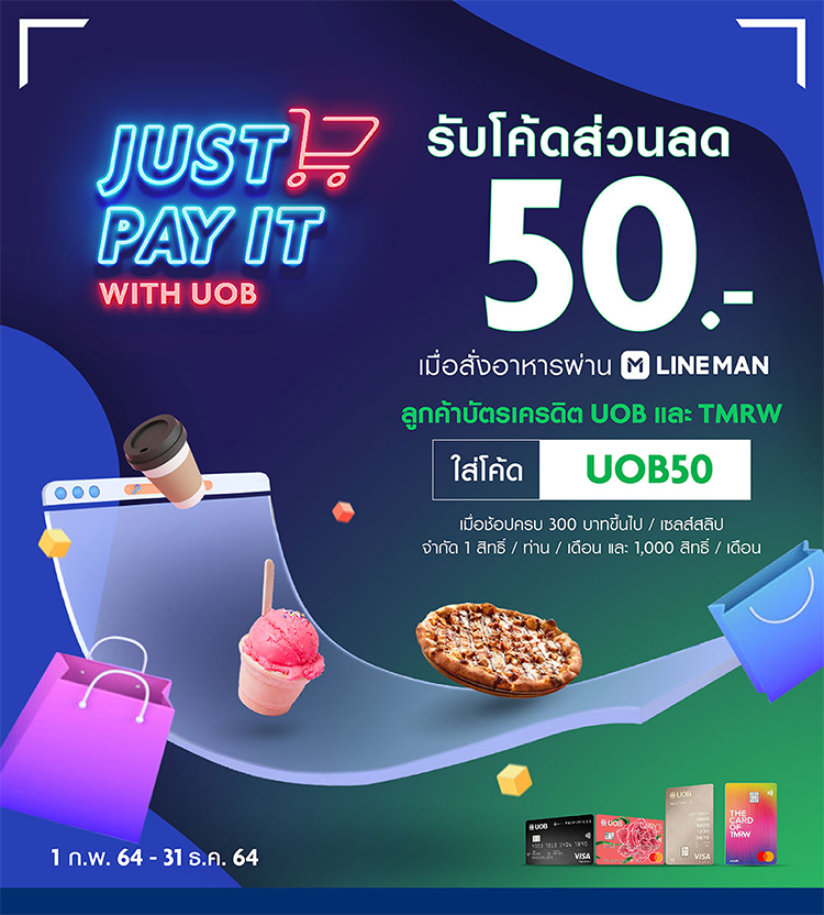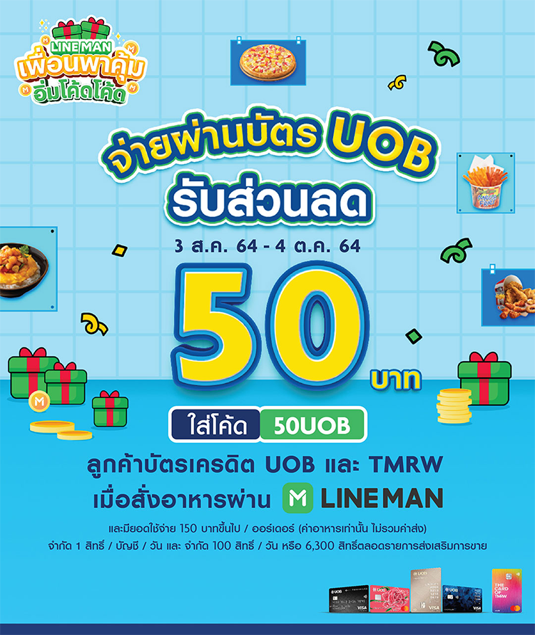 รับโค้ดส่วนลด 50 บาท เมื่อสั่งอาหารผ่าน LINE MAN ใส่โค้ด UOB50 เมื่อมียอดใช้จ่าย 300 บาทขึ้นไปต่อ/ออร์เดอร์ (ค่าอาหารเท่านั้น) เมื่อชำระค่าอาหารด้วยบัตรเครดิตยูโอบี / บัตรเครดิต TMRW (ยกเว้นบัตรเครดิตเพื่อธุรกิจ) ที่ออกในประเทศไทยเท่านั้น