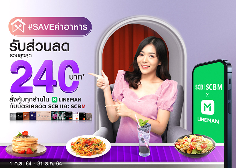 #SAVEค่าอาหาร อร่อยคุ้มทุกร้านใน LINE MAN บัตรเครดิต SCB และ SCB M รับส่วนลดรวมสูงสุด 240 บาท/ท่าน* ตลอดระยะเวลาส่งเสริมการขาย