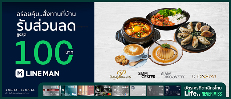 รับส่วนลดสูงสุด 100 บาท* เมื่อสั่งอาหารผ่านแอปพลิเคชัน Line Man และชำระเงินผ่าน บัตรเครดิตวันสยามกสิกรไทย หรือบัตรเครดิตกสิกรไทยประเภทอื่นๆ ครบ 300 บาทขึ้นไปการสั่งซื้อ 1 ครั้ง (เฉพาะร้านอาหารร่วมรายการภายในศูนย์การค้าสยามพารากอน สยามเซ็นเตอร์ สยามดิสคัฟเวอรี่ และไอคอนสยาม)
