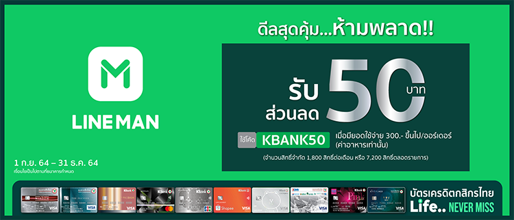 สิทธิพิเศษบัตรเครดิตกสิกรไทย เมื่อสั่งอาหารที่ Line Man รับส่วนลด 50 บาท ใส่โค้ด
