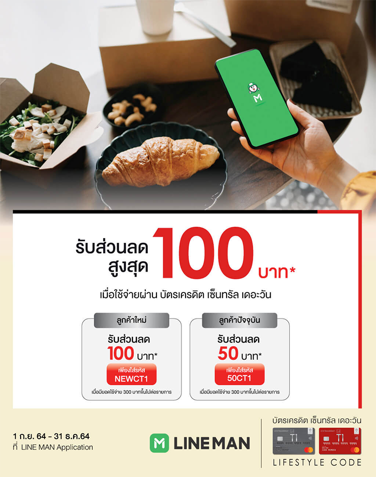 รับส่วนลดค่าอาหารสูงสุด 100 บาท* เมื่อใช้จ่ายผ่านบัตรเครดิต เซ็นทรัล เดอะวัน ที่แอปพลิเคชั่น LINE MAN