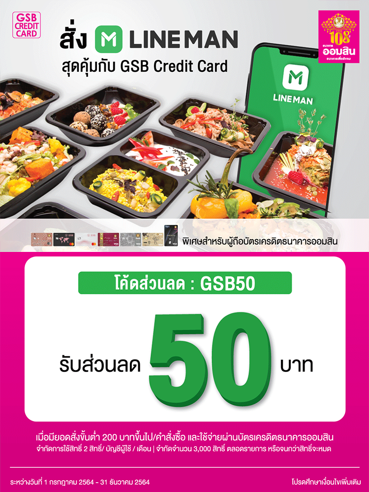 สิทธิพิเศษสำหรับผู้ถือบัตรเครดิตธนาคารออมสิน รับส่วนลด 50 บาท เมื่อมียอดสั่งขั้นต่ำ 200 บาทขึ้นไป/คำสั่งซื้อ ที่ LINEMAN