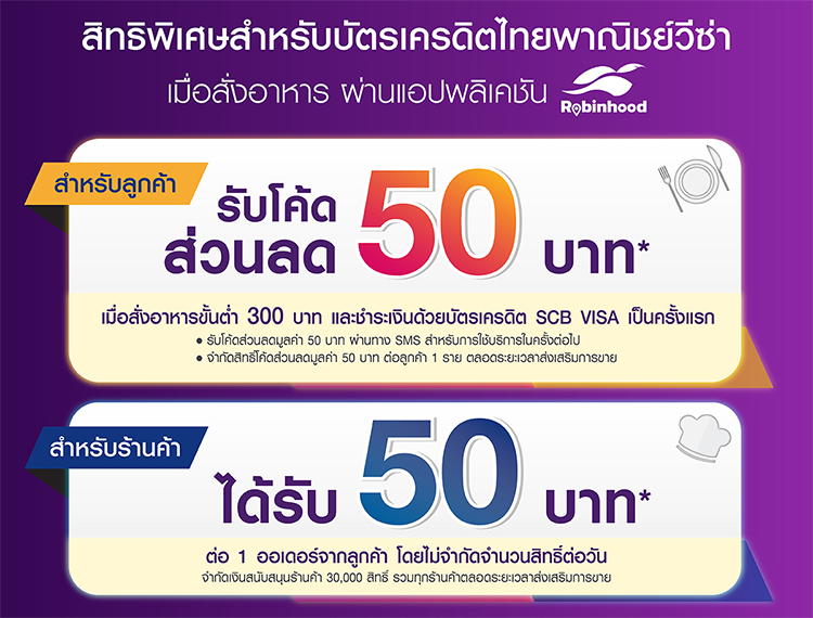 - สิทธิพิเศษสำหรับผู้ถือบัตรเครดิตไทยพาณิชย์วีซ่า (ยกเว้นบัตรเครดิตนิติบุคคล) ("ผู้ถือบัตร") รับโค้ดส่วนลดมูลค่า 50 บาท เมื่อชำระเงินด้วยบัตรเครดิตไทยพาณิชย์วีซ่า ผ่านแอปพลิเคชัน Robinhood เป็นครั้งแรก และมียอดการสั่งอาหารตั้งแต่ 300 บาทขึ้นไป/ คำสั่งซื้อ