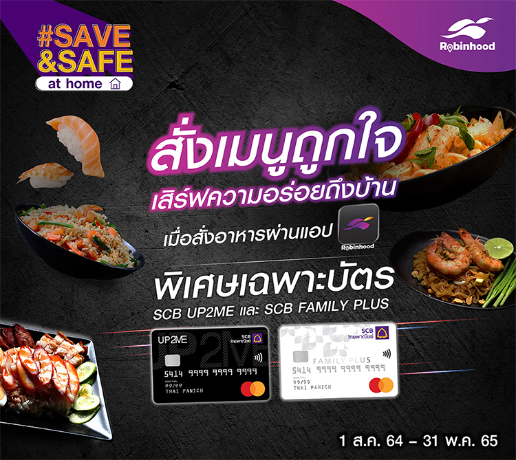 - สำหรับบัตรเครดิต SCB Family Plus รับส่วนลด 60 บาท เมื่อสั่งอาหารผ่านแอปพลิเคชัน Robinhood ตั้งแต่ 300 บาทขึ้นไป/รายการสั่งซื้อ จำกัด 2 สิทธิ์/ท่าน/เดือน