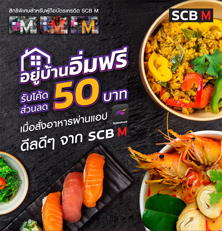 รับโค้ดส่วนลด 50 บาท เมื่อสั่งอาหารผ่านแอปโรบินฮู้ด สิทธิพิเศษสำหรับลูกค้าผู้ถือบัตรเครดิต SCB M เท่านั้น