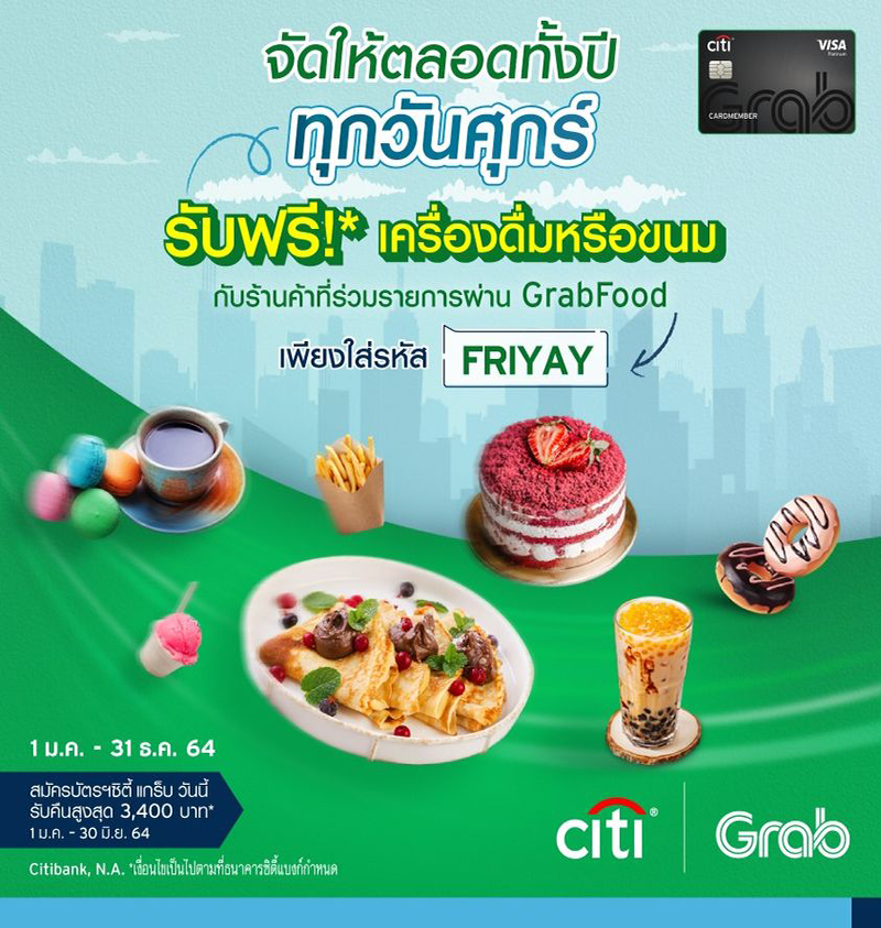 ผู้ถือบัตรเครดิตซิตี้ แกร็บ รับฟรี* เครื่องดื่มหรือขนมกับร้านค้าที่ร่วมรายการผ่าน GrabFood ทุกวันศุกร์ เพียงใส่รหัส FRIYAY ใช้ได้เฉพาะวันศุกร์เท่านั้น!!