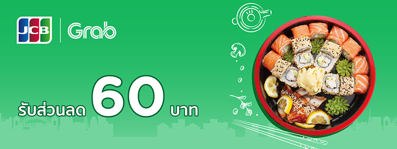 รับส่วนลดค่าอาหาร 60 บาท/ ครั้ง (ไม่รวมค่าส่ง) สำหรับการสั่งอาหารผ่าน GrabFood เมื่อมียอดสั่งขั้นต่ำ 300 บาท เพียงระบุโค้ด JCBGRAB60 และชำระเงินผ่านบัตรเครดิต KTC JCB PLATINUM ทุกประเภท