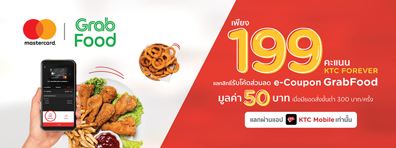 แลกสิทธิ์รับโค้ดส่วนลด e-Coupon GrabFood มูลค่า 50 บาท (เมื่อมียอดสั่งขั้นต่ำ 300 บาท) เพียง 199 คะแนน KTC FOREVER แลกคะแนนผ่านแอป KTC Mobile เท่านั้น