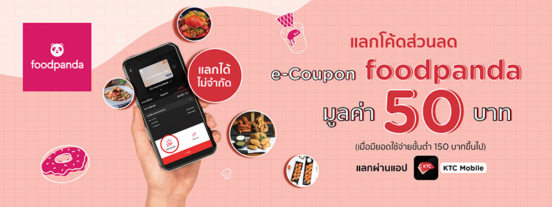 แลกโค้ดส่วนลด e-Coupon Foodpanda มูลค่า 50 บาท (เมื่อมียอดใช้จ่ายขั้นต่ำ 150 บาท) เพียง 399 คะแนน KTC FOREVER แลกได้ไม่จำกัด แลกคะแนนผ่านแอป KTC Mobile เท่านั้น