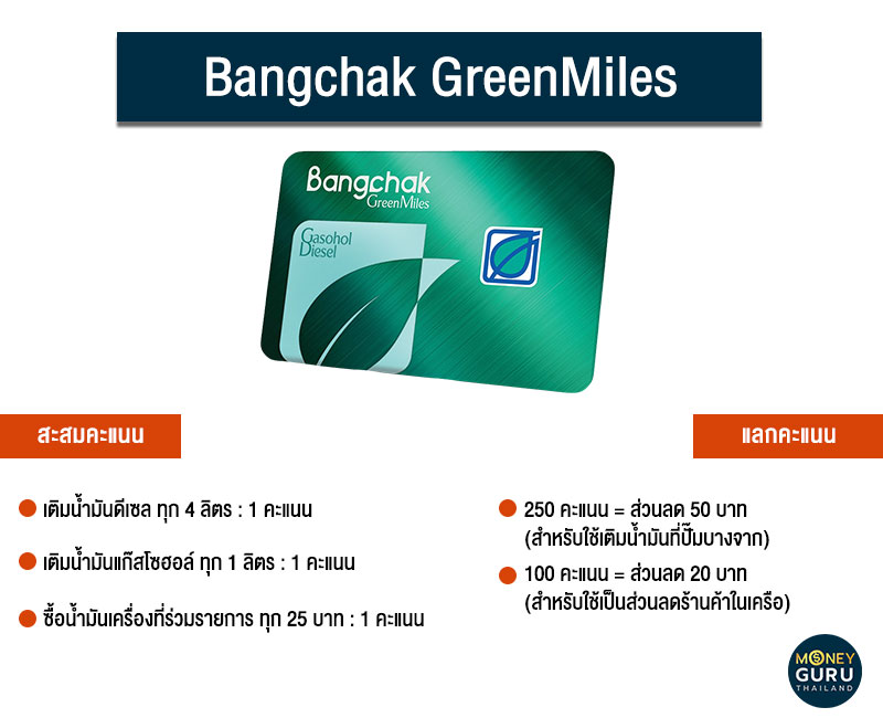 มาต่อกันที่บัตรเติมน้ำมันจากปั๊มบางจาก กันบ้างค่ะ "Bangchak Greenmiles" สามารถสมัครบัตรได้ที่ปั๊มบางจากหรือผ่านช่องทางออนไลน์ นอกจากจะสะสมคะแนนเพื่อใช้เป็นส่วนลดค่าน้ำมันแล้ว ยังใช้เป็นส่วนลดร้านค้าในเครือ และสิทธิพิเศษอื่นๆ อีก เช่น ใช้เป็นส่วนลดโรงภาพยนตร์เครือ SF, ใช้เป็นส่วนลดห้องพักโรงแรมในเครือเซ็นทารา เป็นต้น