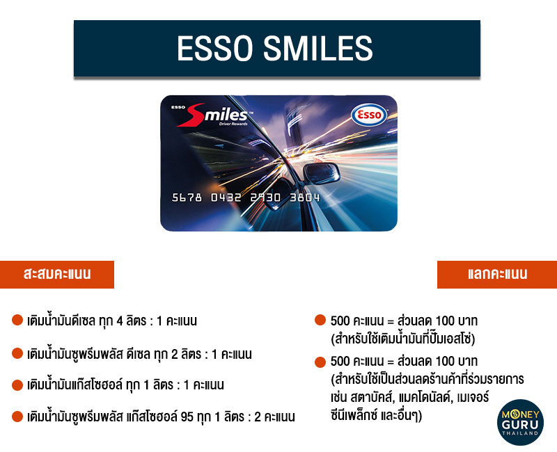 "ESSO SMILES" จากปั๊มเอสโซ่ ก็สามารถสมัครบัตรได้ที่ปั๊มเอสโซ่ที่ร่วมรายการ และลงทะเบียนออนไลน์เพื่อรับสิทธิพิเศษเพิ่มเติม นอกจากจะสะสมคะแนนเพื่อใช้เป็นส่วนลดค่าน้ำมันแล้ว ยังใช้เป็นส่วนลดร้านค้าที่ร่วมรายการ เช่น สตาบัคส์, แมคโดนัลด์ เป็นต้น