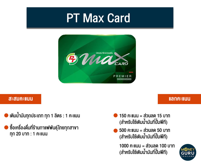 ถึงคิวของปั๊มน้ำมันพีที กับบัตร "PT Max Card" สามารถสมัครบัตรได้ที่ปั๊มพีทีหรือผ่านช่องทางออนไลน์ นอกจากจะสะสมคะแนนเพื่อใช้เป็นส่วนลดค่าน้ำมันแล้ว ยังใช้เป็นส่วนลดร้านค้าในเครือ และแลกรับของรางวัลอื่นๆ เช่น TV, ตู้เย็น, เครื่องซักผ้า เป็นต้น