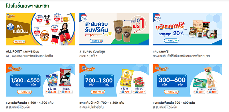 สำหรับแต้มสะสมจากบัตรสมาชิก All Member ทุกๆ 100 แต้ม เท่ากับ 1 บาท สามารถนำไปใช้เป็นส่วนลด หรือใช้แทนเงินสด หรือนำไปแลกของพรีเมี่ยมเฉพาะรายการส่งเสริมการขายที่ร่วมรายการ มีกิจกรรมใช้แต้มเพื่อชิงรางวัล นอกจากนี้ยังมีโปรโมชั่นสินค้าแจกแต้มจัดหนัก ที่หากเราซื้อสินค้าที่ร่วมรายการตามเงื่อนไข เราก็จะสามารถสะสมแต้มได้เพิ่มมากกว่าการซื้อปกติอีกด้วยค่ะ