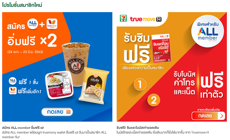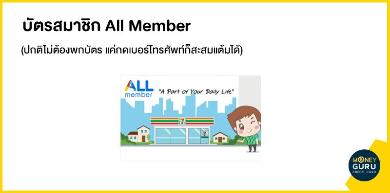 บัตรสมาชิก ALL member เป็นบัตรสมาชิกสำหรับการใช้จ่ายของบริษัทในกลุ่ม ซีพี ออลล์ จำกัด (มหาชน) โดยเมื่อสมาชิกที่เป็น ALL member มาใช้จ่ายที่ร้าน 7-Eleven หรือ บริษัทในกลุ่มซีพี ออลล์ จะได้รับสิทธิประโยชน์และสิทธิพิเศษต่างๆ ที่คุ้มค่า เช่น การสะสมแต้ม นำแต้มมาใช้แทนเงินสด ซื้อสินค้าในราคาพิเศษ หรือโปรโมชั่นต่างๆ อีกมากมาย