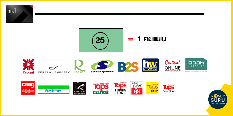 บัตรสมาชิก The 1 Card สามารถสะสมยอดการใช้จ่ายได้ที่ ห้างเซ็นทรัลทุกสาขา, เซ็นทรัล เอมบาสซี, เซน, โรบินสัน, ซูเปอร์สปอร์ต, บีทูเอส, โฮมเวิร์ค, ไทวัสดุ, บ้าน แอนด์ บียอนด์, เซ็นทรัล ออนไลน์, เพาเวอร์บาย, ออฟฟิศเมท, แฟมิลี่มาร์ท, เซ็นทรัลฟู้ดฮอลล์, ท็อปส์ มาร์เก็ต, ท็อปส์ซูเปอร์สโตร์, ท็อปส์ ซูเปอร์คุ้ม, ท็อปส์ เดลี่, มัทสึโมโตะ คิโยชิ และร้านค้าที่เข้าร่วมรายการในกลุ่มเซ็นทรัล มาร์เก็ตติ้ง (CMG) โดยเงื่อนไขในการสะสมคะแนนจะแยกตามร้านค้าที่ร่วมรายการ ดังนี้