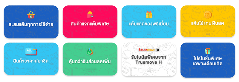- ทุก 800 คะแนน = 100 บาท - แลกคะแนนแทนเงินสดใช้เป็นส่วนลด หรือซื้อสินค้าราคาพิเศษที่แฟมิลี่มาร์ท, เซ็นทรัล ฟู้ด ฮอลล์, ท็อปส์ มาร์เก็ต, ท็อปส์ ซูเปอร์สโตร์, ท็อปส์ ซูเปอร์คุ้ม, ท็อปส์ เดลี่ และท็อปส์ ออนไลน์