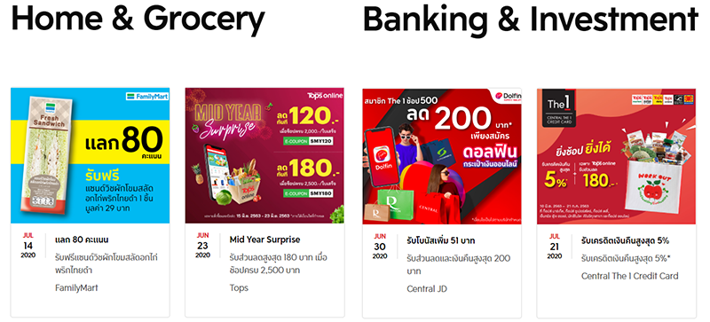 สำหรับโปรโมชั่นคะแนนสะสมของ The 1 Card สามารถนำไปใช้ได้ใน 8 หมวดด้วยกัน Let's Move On, Eat Around, Fashion & Lifestyle, Play & Learn, Travel & Leisure, Home & Grocery และ Banking & Investment ตามตัวอย่างด้านล่างนี้นะคะ