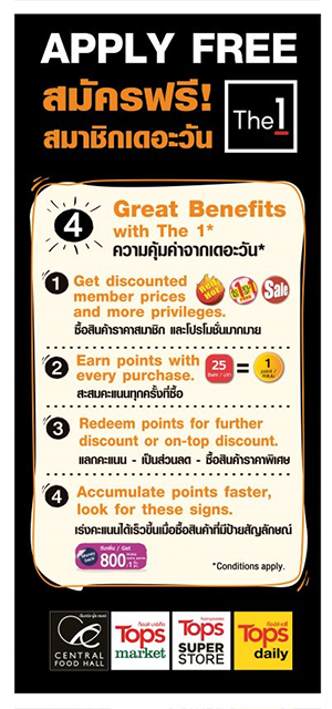 ทุก 25 บาท = 1 คะแนน (ไม่ตัดเศษคะแนน) >> เมื่อมียอดใช้จ่ายที่ เซ็นทรัล ฟู้ด ฮอลล์, ท็อปส์ มาร์เก็ต, ท็อปส์ ซูเปอร์สโตร์, ท็อปส์ ซูเปอร์คุ้ม, ท็อปส์ เดลี่ และท็อปส์ ออนไลน์