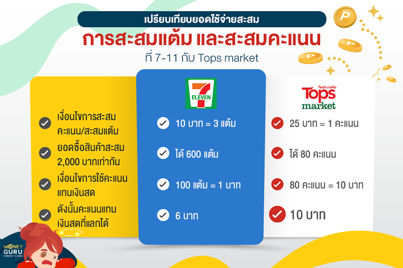 สรุปง่ายๆ จากตัวอย่างนี้ การสะสมแต้มที่ 7-11 ได้รับแต้มมากกว่าการช้อปที่ Family Mart ก็จริงค่ะ แต่เงื่อนไขการใช้แต้ม หรือคะแนนแทนเงินสด ก็ต้องใช้แต้มมากกว่าถึงจะใช้แทนเงินสดได้ในจำนวนที่เท่ากัน ในกรณีตัวอย่างนี้ก็ถือได้ว่าการสะสมคะแนนที่ร้าน FamilyMart เพื่อใช้เป็นคะแนนแทนเงินสดในครั้งต่อไปก็คุ้มกว่าการสะสมแต้มที่ 7-11 ค่ะ