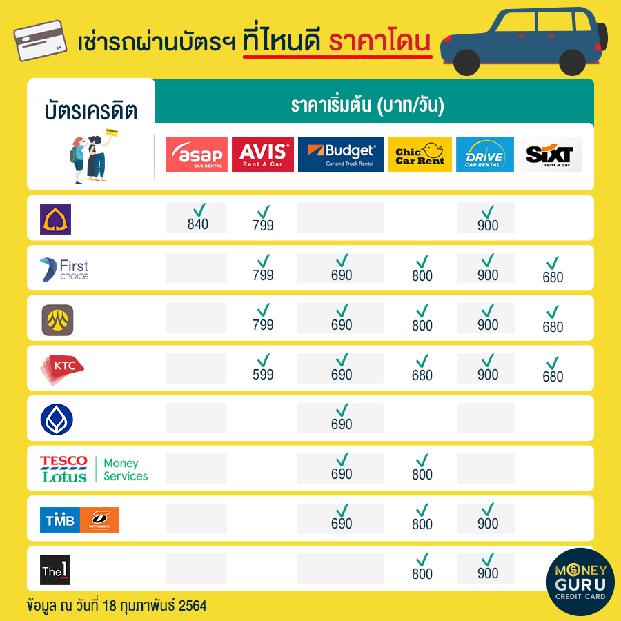 - ข้อมูลข้างต้น เป็นการรวบรวมข้อมูลการจองรถเช่าผ่านบัตรเครดิตที่มีการระบุราคาการเช่า ยกเว้นโปรโมชั่นส่วนลดที่ไม่ระบุราคาการเช่า