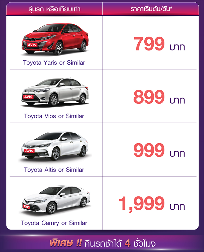 - รุ่นรถหรือเทียบเท่า Toyota Altis (1800cc) ราคา 999 บาท/วัน