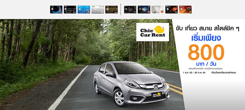 สิทธิพิเศษบัตรเครดิตทีเอ็มบี บัตรเครดิตธนชาต และบัตรเครดิตนครหลวงไทย เมื่อจองรถเช่ากับ Chic Car Rent รับส่วนลด 60% จากราคามาตรฐาน ที่มอบให้กับผู้ถือบัตรราคาเริ่มต้น 800 บาท พร้อมฟรีประกันภัยชั้น 1 แบบไม่มีค่าความรับผิดชอบ