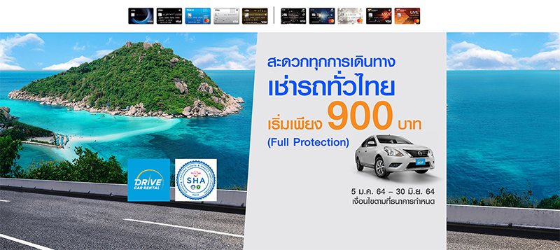 สิทธิพิเศษบัตรเครดิตทีเอ็มบี บัตรเครดิตธนชาต และบัตรเครดิตนครหลวงไทย จองรถเช่า กับ Drive Car Rental เช่ารถทั่วไทย เริ่มเพียง 900 บาท (Full Protection)