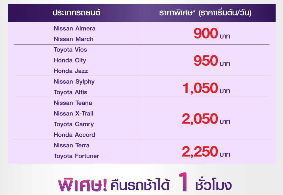 - รุ่นรถหรือเทียบเท่า Toyota Yaris (1200cc) ราคา 799 บาท/วัน